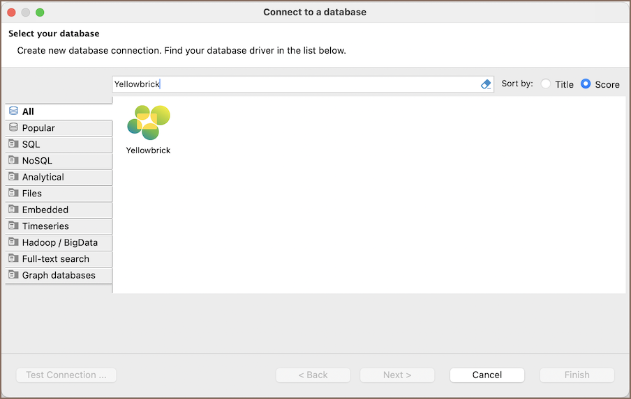 Field Description Connect by (Host/URL) Choose whether you want to connect using a host or a URL. URL If you are connecting via URL, enter the URL of your Yellowbrick database here. This field is hidden if you are connecting via the host. Host If you are connecting via host, enter the host address of your Yellowbrick database here. Database Enter the name of the Yellowbrick database you want to connect to. Show all databases (Enabled by default) Displays all databases in the database navigator.