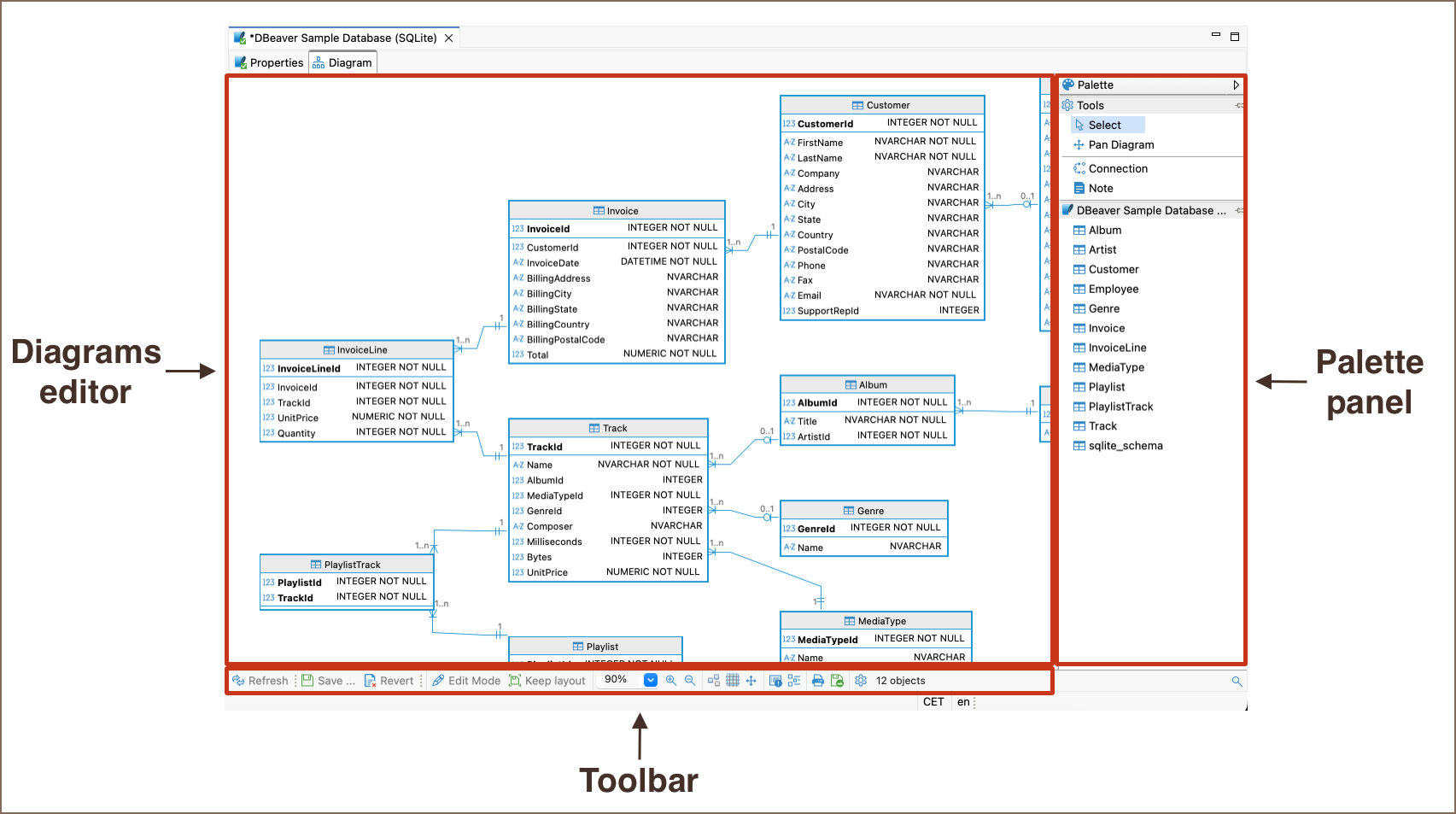 - Diagrams editor: View and rearrange entities and their relationships.
