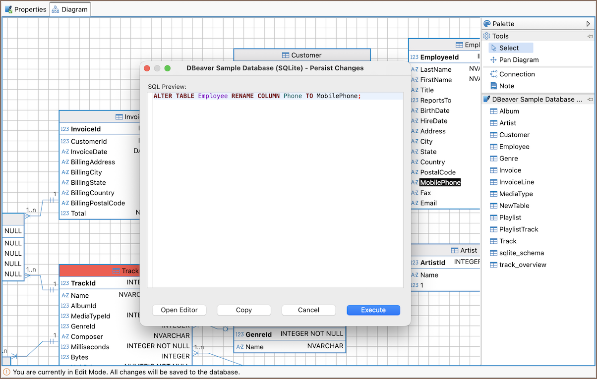 When Edit mode is enabled, diagram actions are converted into an SQL script. Review the script before saving the changes.