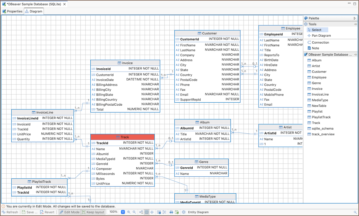 Diagrams are read-only by default. You can use Edit mode to create and modify database objects directly from a diagram and apply those changes to the database.