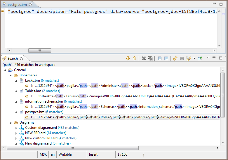 After you click Search, the results appear in a Search view. The results represent a tree or list of files with the search combination highlighted: