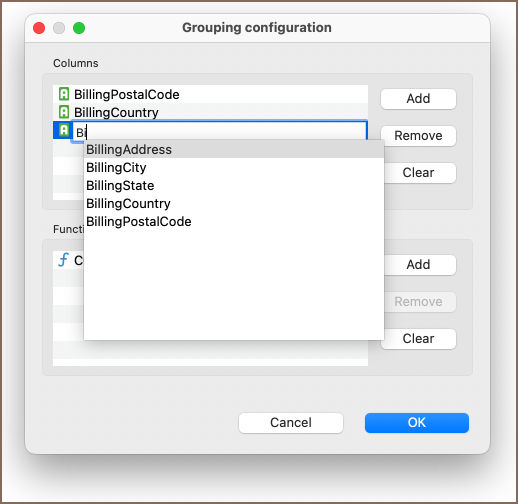 To remove a function, in the same Grouping Configuration window, select the function and click Remove, then click OK. To remove all functions, click Clear and then OK.