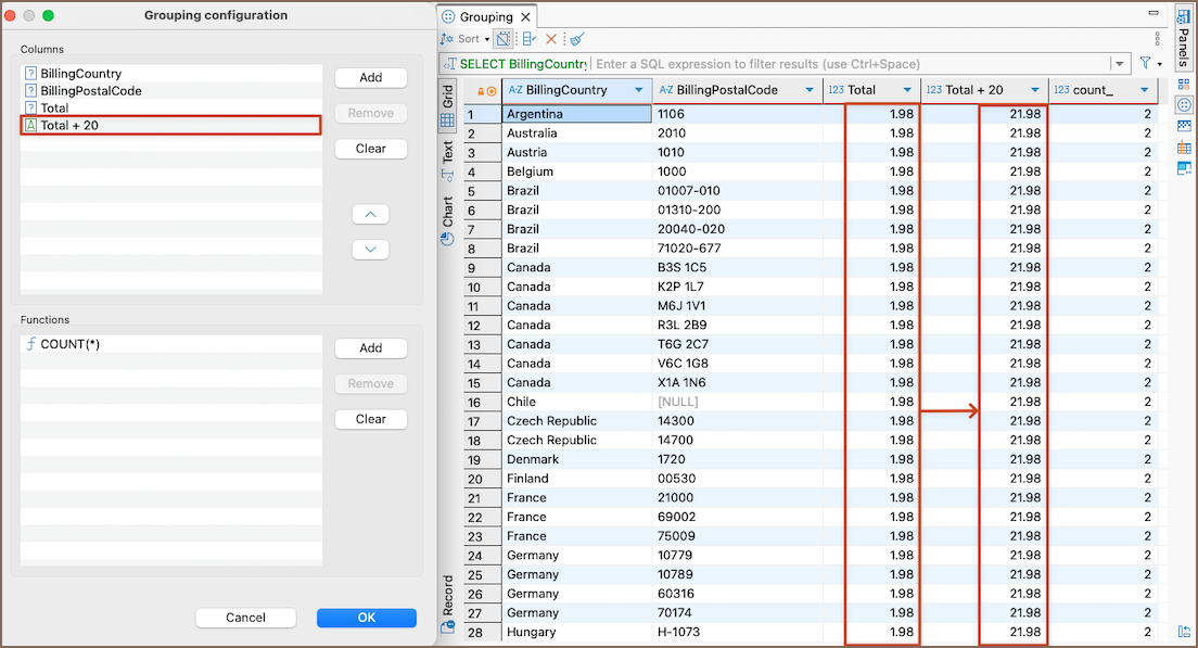 The Grouping panel provides tools to calculate statistics based on a table of a custom SQL query.