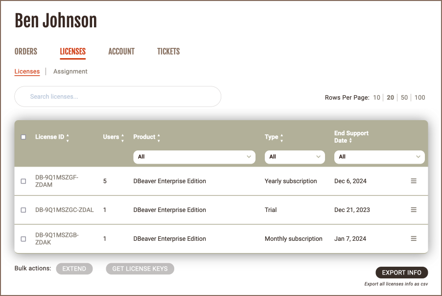 At the bottom of the page you can find the license key required to start using DBeaver. There are two options how to copy your license key from the personal account: