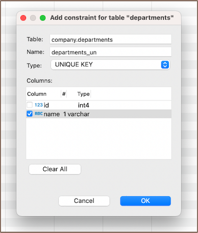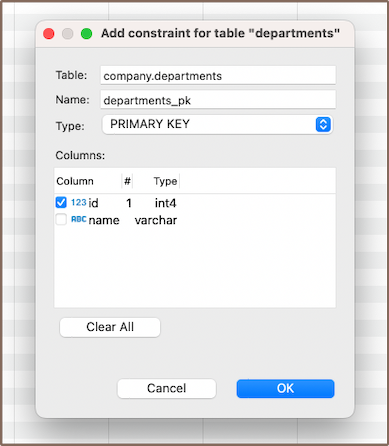 Field Description Name Here, you can specify the name of the constraint. It's a good practice to choose a name that clearly indicates the purpose of the constraint. Type This is where you select the type of constraint. Options include Primary Key, Unique Key, Check. The type of constraint you choose will depend on the rule you want to enforce on the column. Columns In this section, you can select the column or columns that the constraint will apply to. If you're creating a composite constraint, you can select multiple columns. -