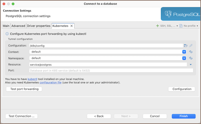 next to the field, a list of available services to connect to will open. From this list, you can select the service you wish to connect to.Port Configure Kubernetes port forwarding by using kubectl.Info