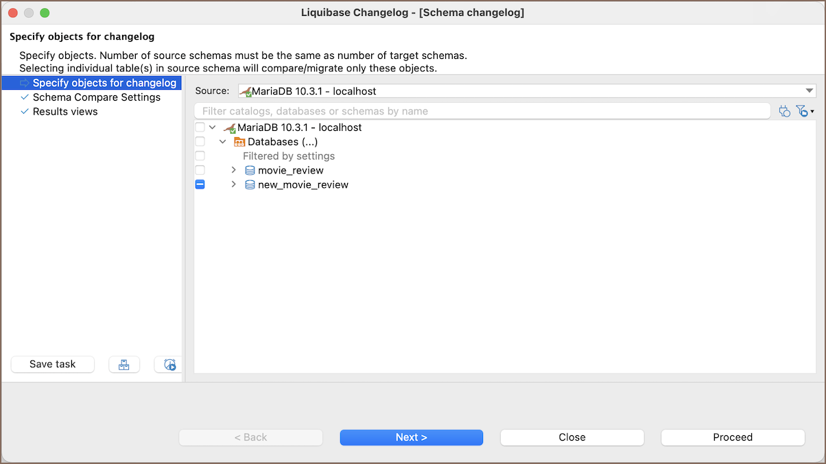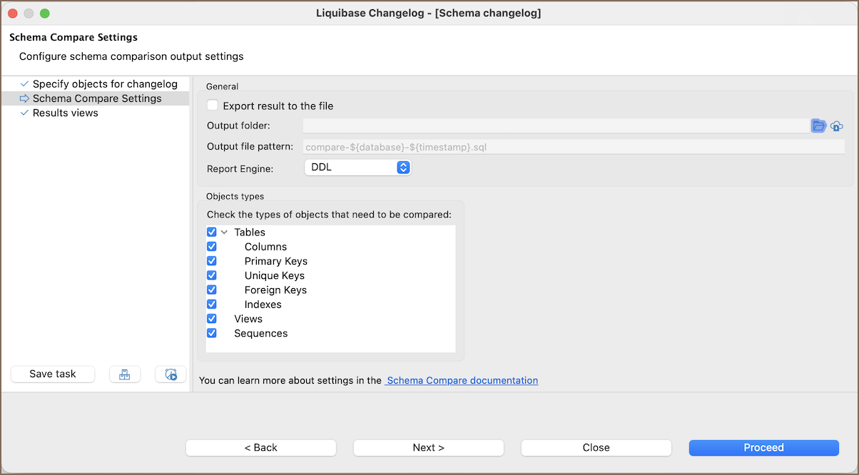 Setting Description Export result to the file Saves the generated diff to a file instead of showing it in the viewer. Output folder Folder where the generated file will be saved. Enabled only when Export result to the file is turned on. Output file pattern Lets you use variables such as database name or timestamp to build the file name. Enabled only when Export result to the file is turned on. See more details about Pre-configured variables. Report Engine Selects the output format: DDL, Change Log, JSON, YAML, or Plain text. Enabled only when Export result to the file is turned on. Object types Chooses which structural objects to include in comparison (tables, columns, keys, views, etc.). With Liquibase PRO, you can work with extended metadata. For details, see the Liquibase PRO guide. Info