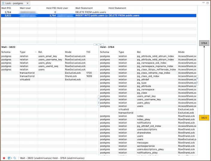 - Review the list of active locks to identify blocking and waiting sessions.