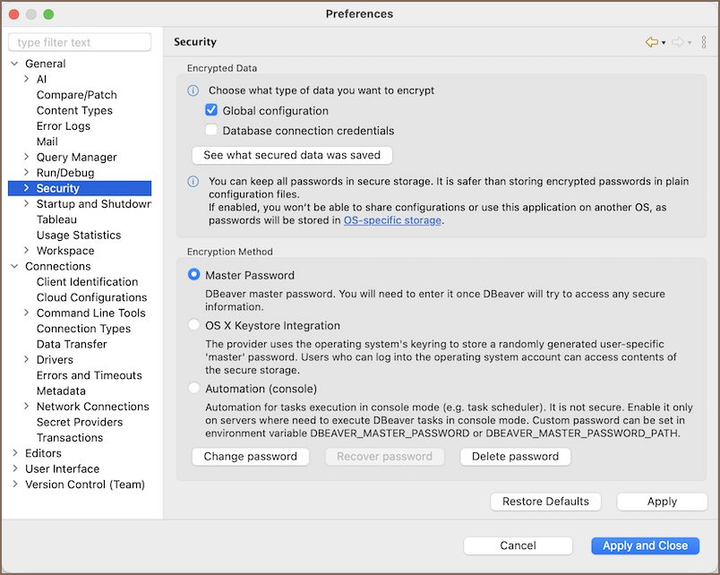 - (Alternatively) When you first attempt to save secure data - DBeaver will prompt you to set up a Master Password.