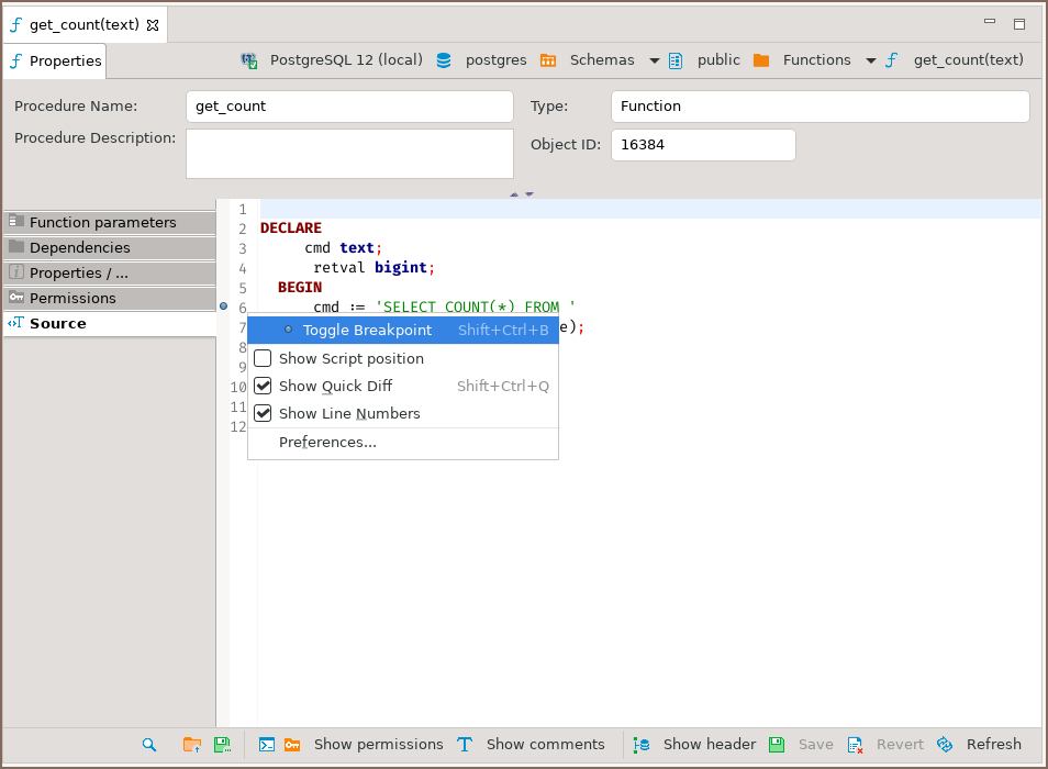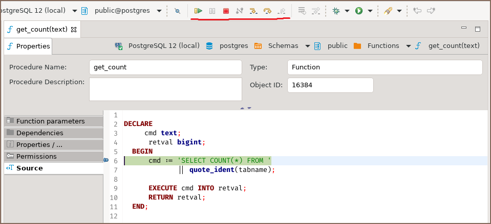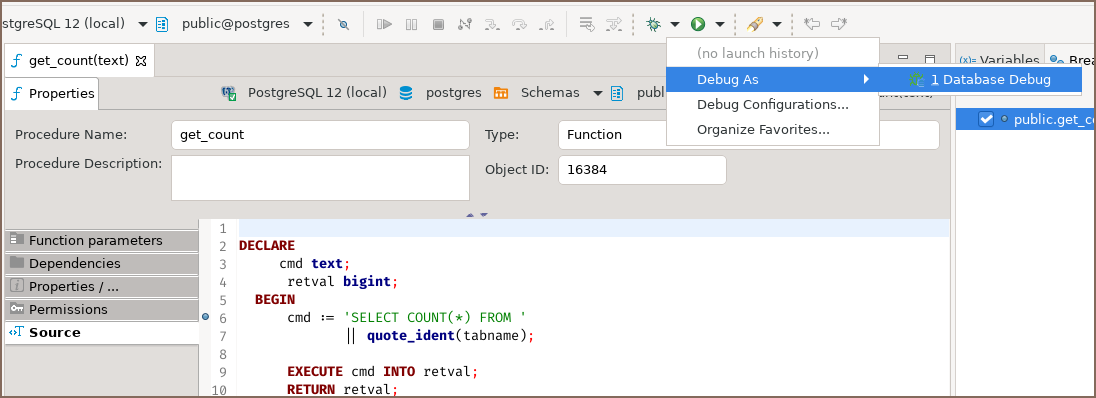 Running debugger in the DBeaver interface¶