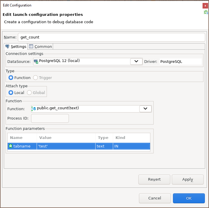 The Edit Configuration dialog opens. Set up input values in the table Function parameters.
