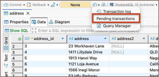 Pending Transactions shows all currently open transactions in the active DBeaver session. It helps you identify uncommitted changes that may lock database objects or block other sessions. Use this window to review active transactions and commit or roll them back.