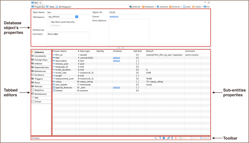- Tabbed editors: These vary depending on your database. Depending on the database you're working with, you'll see different tabs reflecting that particular database's unique characteristics and requirements.