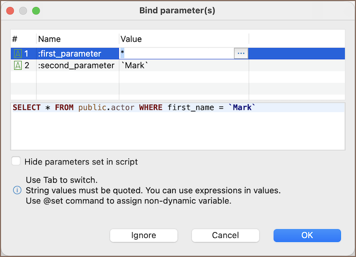 | Anonymous SQL parameters | Permits the usage of unnamed parameters, enabling the SQL editor to recognize placeholders denoted by the character specified in the Anonymous parameter mark field. |
