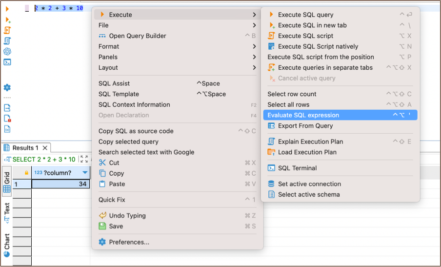 To evaluate an SQL expression, right-click the expression and click Execute -> Evaluate SQL expression on the context menu. This command performs a query of SELECT [expression] FROM DUAL type: