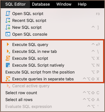 To execute a query under the cursor or selected text, press Ctrl+Enter or right-click the query and click Execute -> Execute SQL Statement on the context menu. You can do the same using the main toolbar or main menu: SQL Editor -> Execute SQL Statement. This executes the SQL query under the cursor or selected text and fills the results pane with the query results.