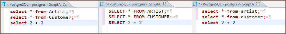 To format a script to upper or lower case, highlight the SQL text, then right-click it and click Format -> To Upper Case / To Lower Case, respectively, on the context menu.