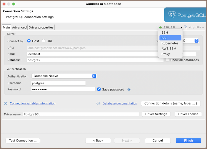 For some databases, an alternative method to configure SSL settings is available through the Driver properties tab. This approach allows access to additional or driver-specific SSL options that may not be present in the main SSL tab: