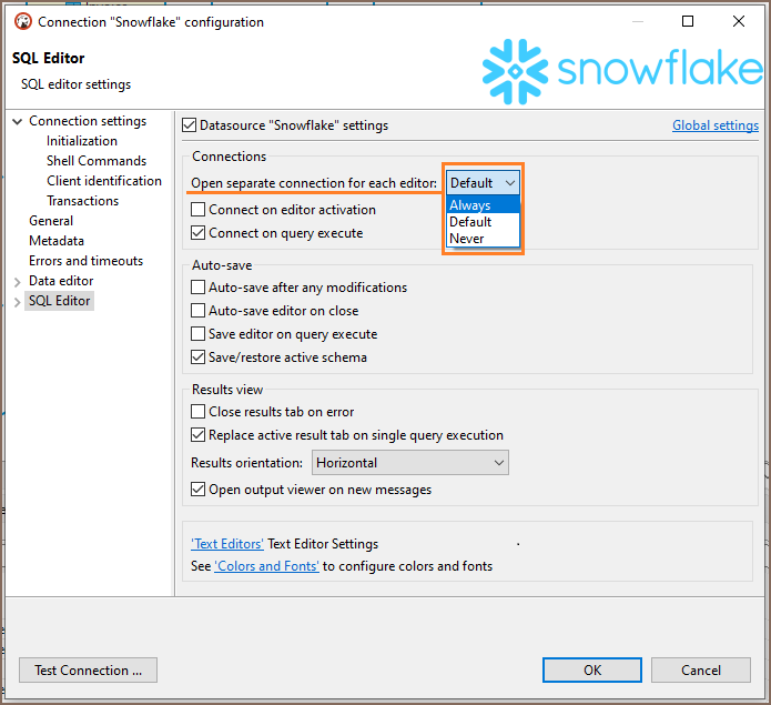 Default option means that DBeaver will create separate connections for SQL Editor and/or metadata read for most databases except these: