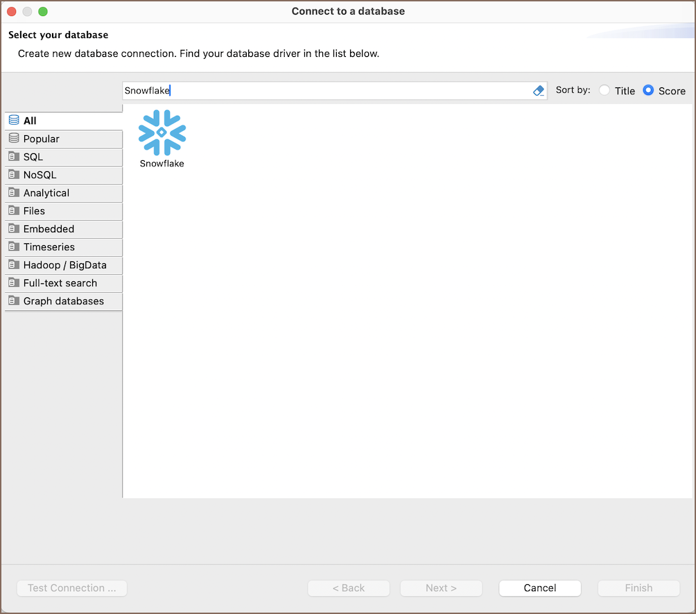 selecting the Snowflake option to connect to the Snowflake database. If you have not yet created a