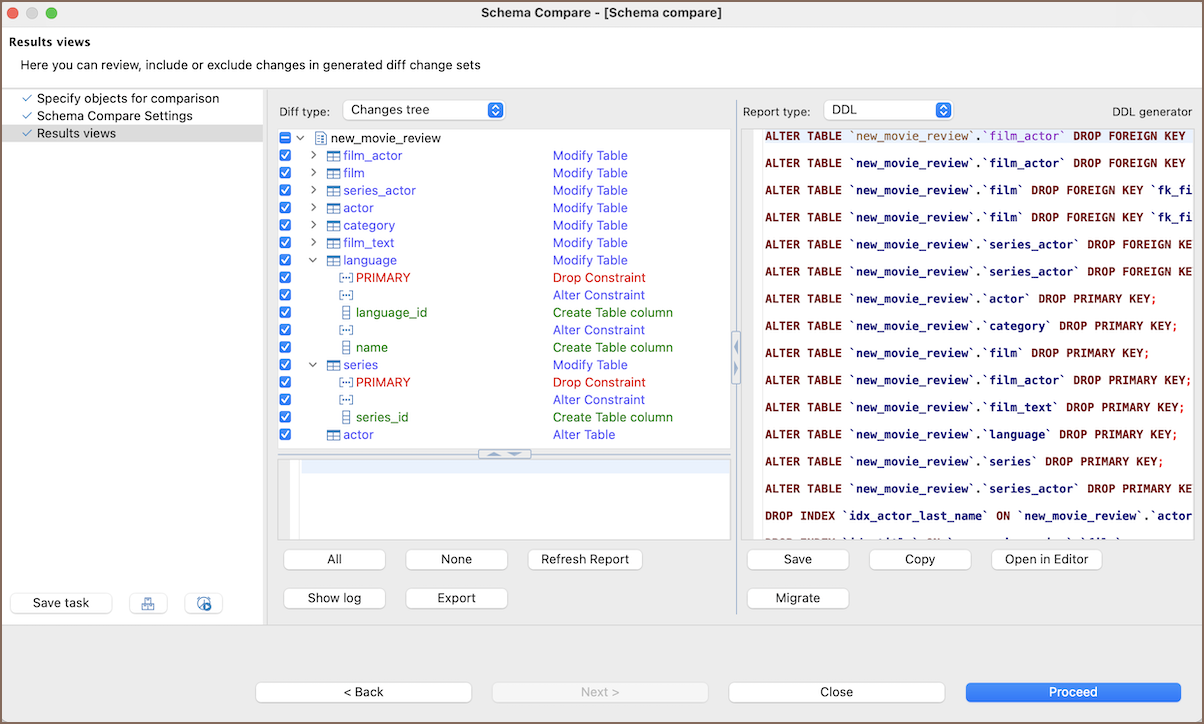 Schema Compare shows the differences between two database structures. It highlights changes in a clean diff view and generates scripts to align one side with the other.