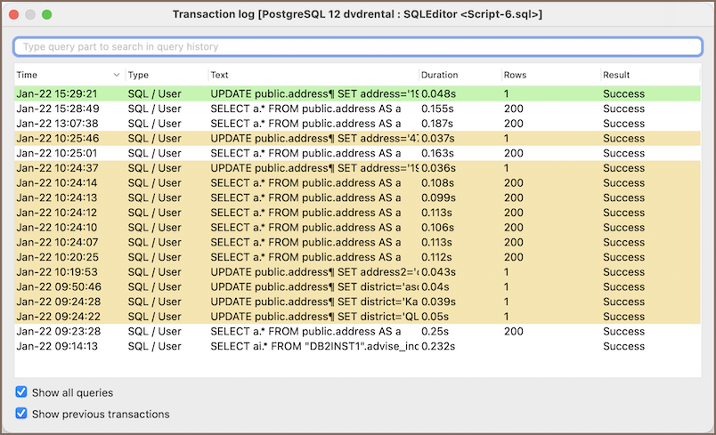 Transaction Log shows all transactions executed during the current DBeaver session. It helps you track data-changing queries, and review their execution status.