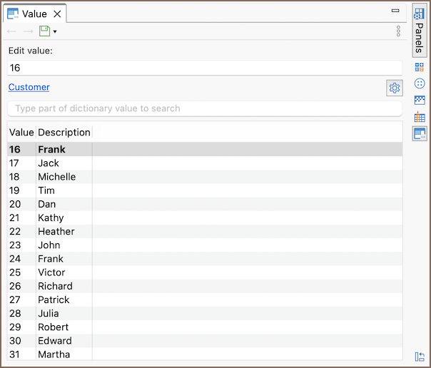 Search - find dictionary entries by typing a value or part of a description string.