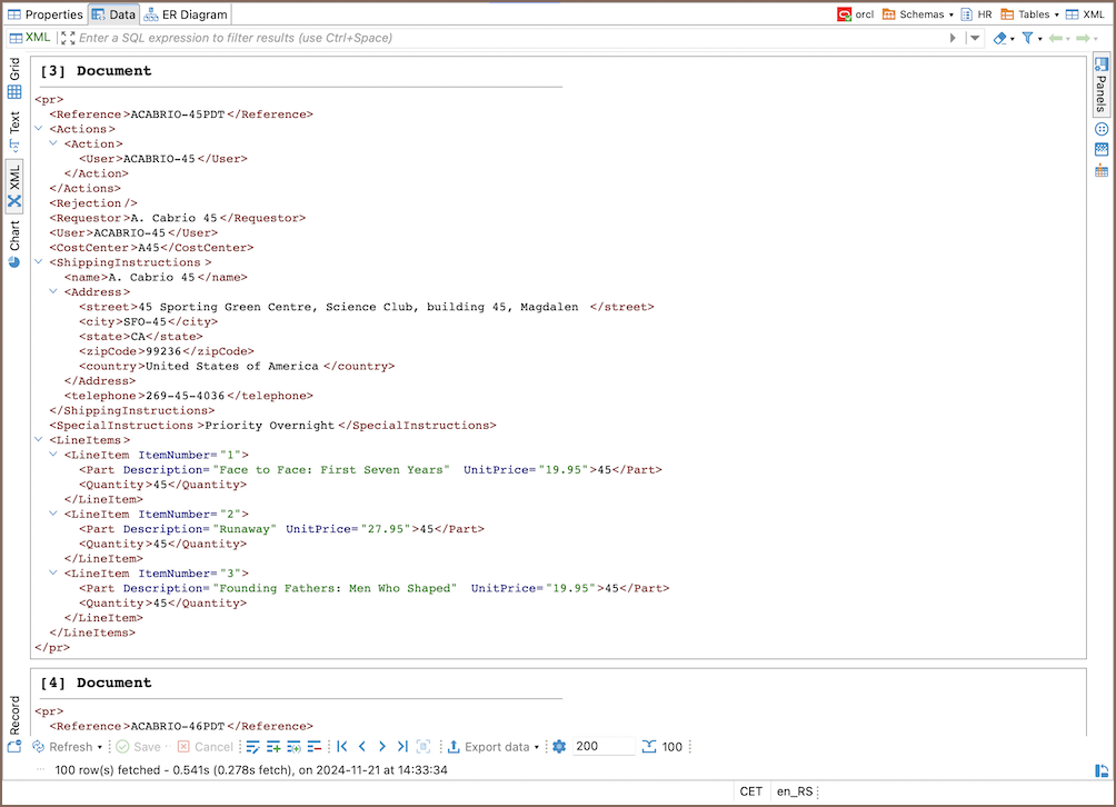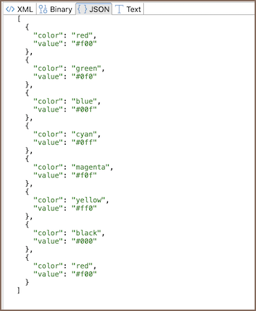 In document-oriented databases such as MongoDB, and in some relational databases, you can edit XML and JSON data using a dedicated XML and JSON tabs in the Data Editor left sidebar.