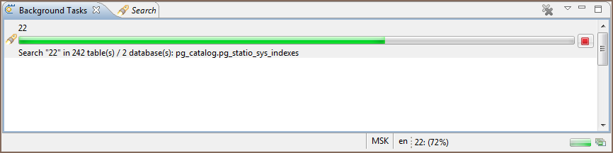 The Background Tasks view shows the progress of such background tasks as search, SQL query execution, etc. The view shows data when background tasks take some noticeable time and is useful when you want to track the progress of lengthy operations. If you open this view at a short task, the view will be empty.