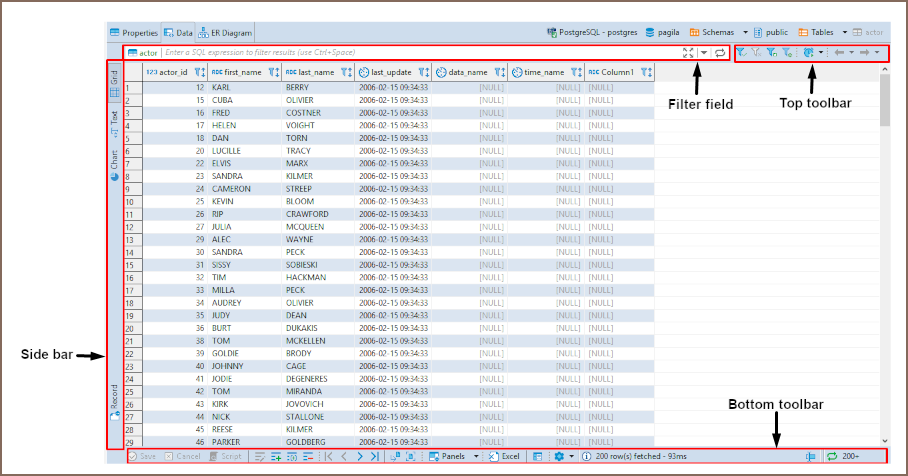 The Data editor allows viewing and editing the data of a database table or view. The central part of the Data editor is the data table. The editor also provides two toolbars and a filter field: