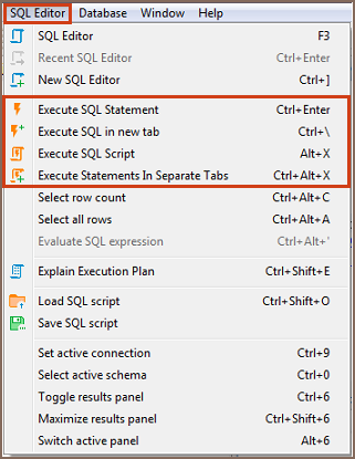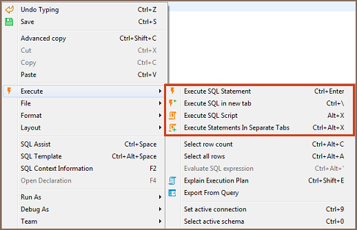 To execute a query under cursor or selected text, press Ctrl+Enter or right-click the query and click Execute -> Execute SQL Statement on the context menu. You can do the same using the main toolbar or main menu: SQL Editor -> Execute SQL Statement. This executes the SQL query under cursor or selected text and fills the results pane with the query results.