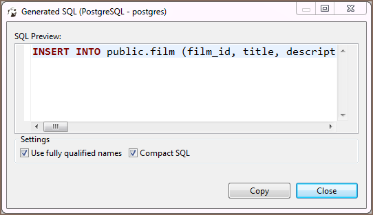 To use table names in the format '[schema name].[table name]', select the Use fully qualified names checkbox. To wrap the SQL query into one line, select the Compact SQL checkbox: