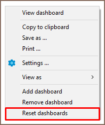 To reset a particular dashboard right-click on it and select Reset dashboards menu option or left click a dashboard and press Reset dashboards button in the dashboards panel's toolbar.