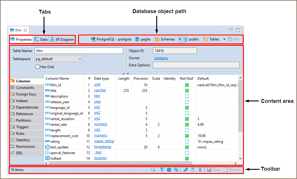 • Properties tab appears for all objects, contains properties of the database object and its sub-entities, see further in this article