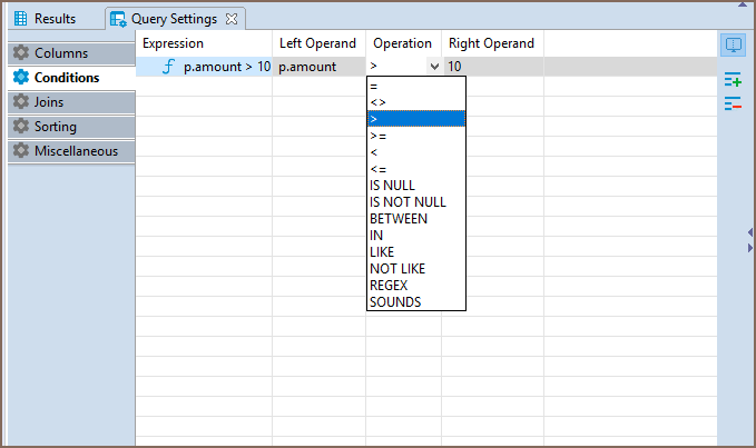Visual Query Builder also allows setting query conditions and adjust representation of query results by means of Query Settings Editor.
