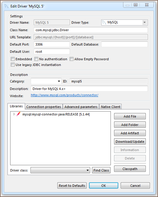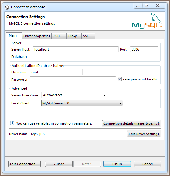 However, the number and type of connection properties are very dependent on the driver. For example, embedded drivers (such as SQLite, Derby Embedded, HSQLDB, H2 Embedded), unlike remote ones, require only the path to the database.