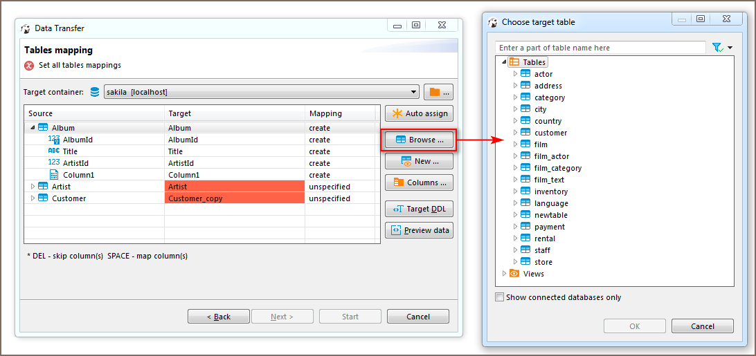 To change mapping type click a cell in Mapping column of Table mapping dialog box and select the required mapping type.