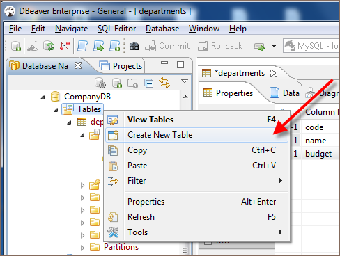 • Set focus to "Tables" in the Database Navigator, select 'Create New Table' from right click.