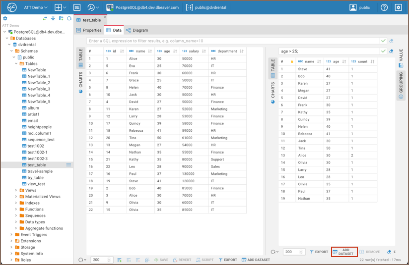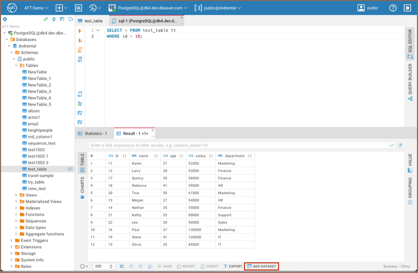 Another way to create a Dataset is to run the query you need in the SQL Editor and use the Result tab as a base. It will appear on the right after clicking the Add Dataset button and entering the new Dataset name.