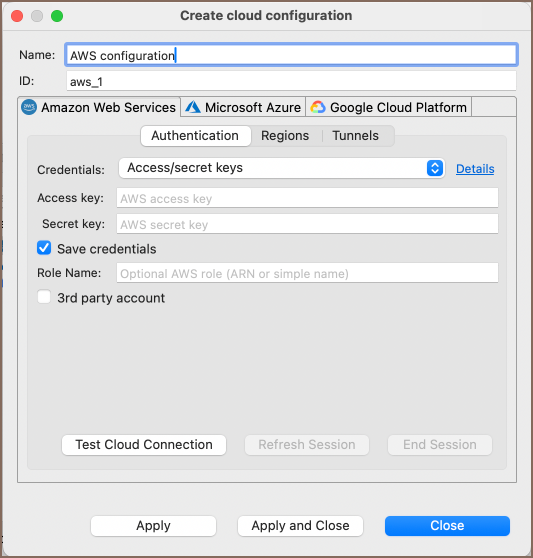 For detailed information about the authentication methods supported by Team Edition for AWS connections, see the Cloud Explorer documentation. If your connection requires SSH, fill in the necessary credentials in the Tunnels tab.