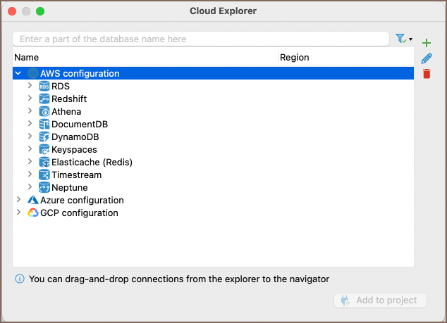 Team Edition facilitates advanced functionalities for efficiently managing and connecting to Amazon Web Services (AWS) databases through its user interface. The process for setting up and altering connections is detailed in the Cloud Explorer article. This article outlines the key steps and prerequisites for connecting to an AWS database using Team Edition.