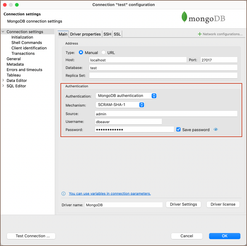• From the Authentication dropdown menu, select the MongoDB authentication method.