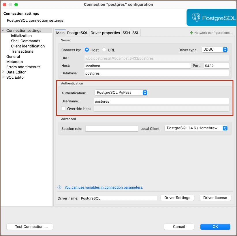 • From the Authentication dropdown menu, select the PostgreSQL Pgpass method.
