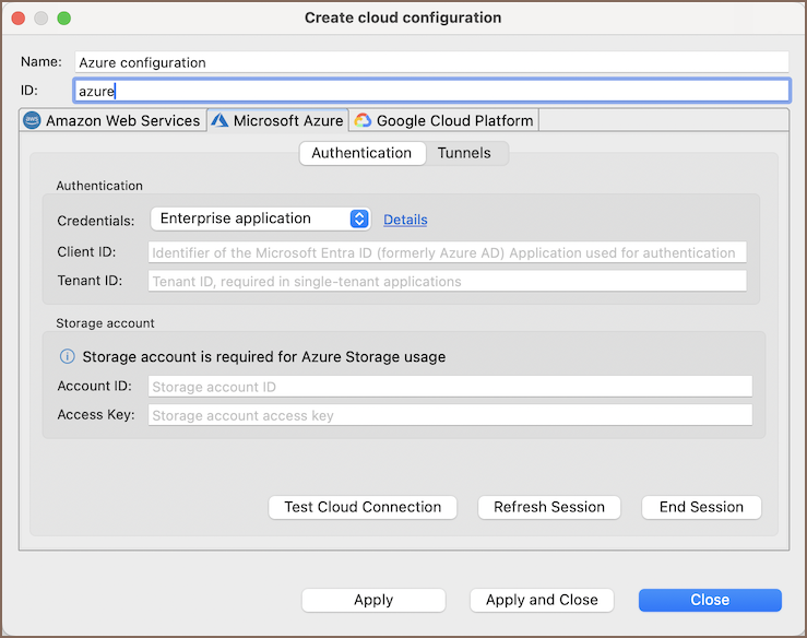 • Navigate to the Microsoft Azure section, choose the authentication type and enter your credentials.