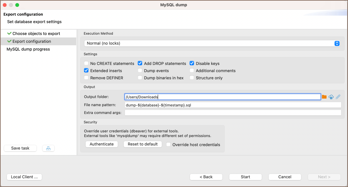 | Execution Method options: | Normal (no locks): This is the default method. It performs the dump without acquiring any locks on the tables. Suitable for databases where minimal disruption is required during the dump process. |