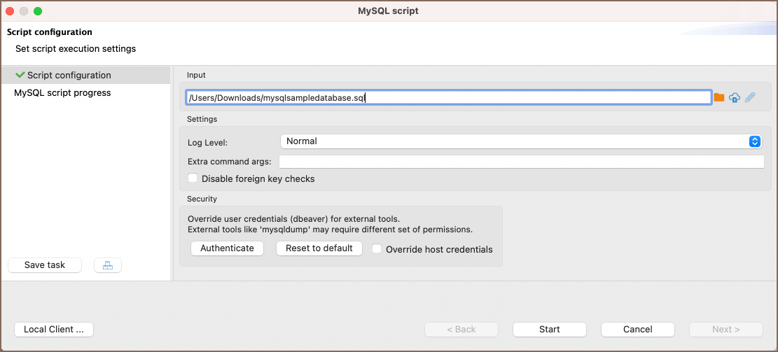 In the input field for specifying the path to the SQL file, you can choose a file from a local directory or