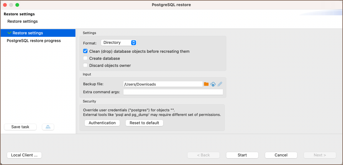 | Format | Choose the format for the restore operation. Options include Directory, Tar, Custom, and Plain. |