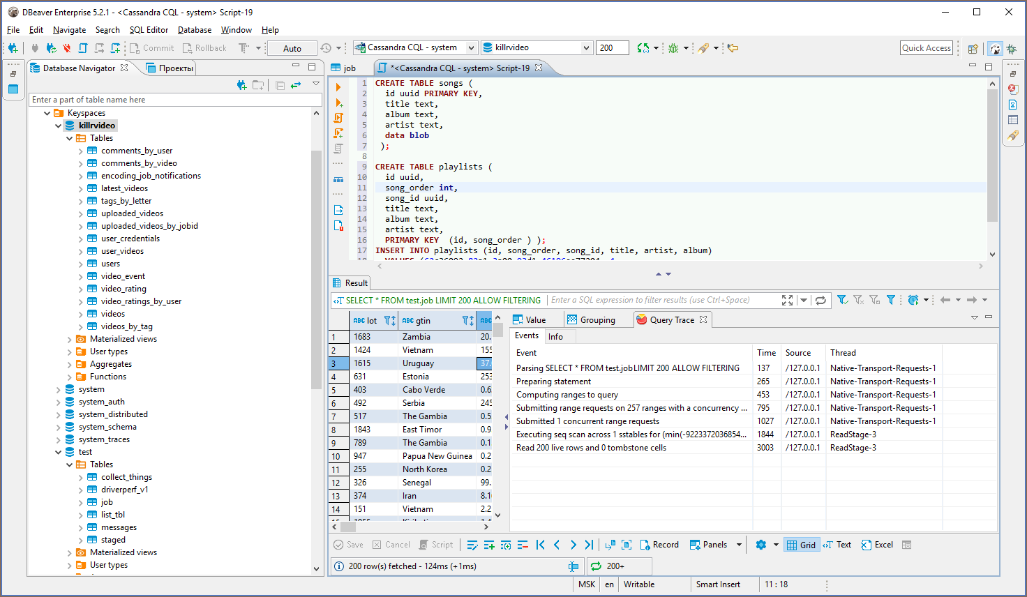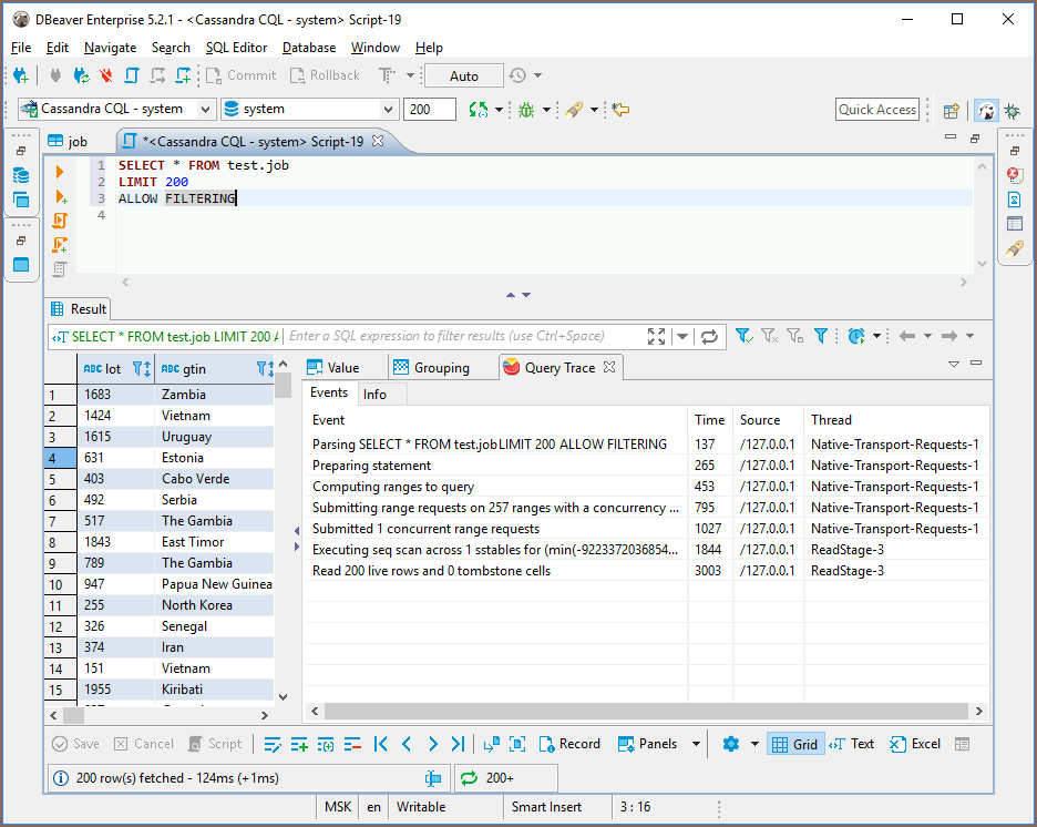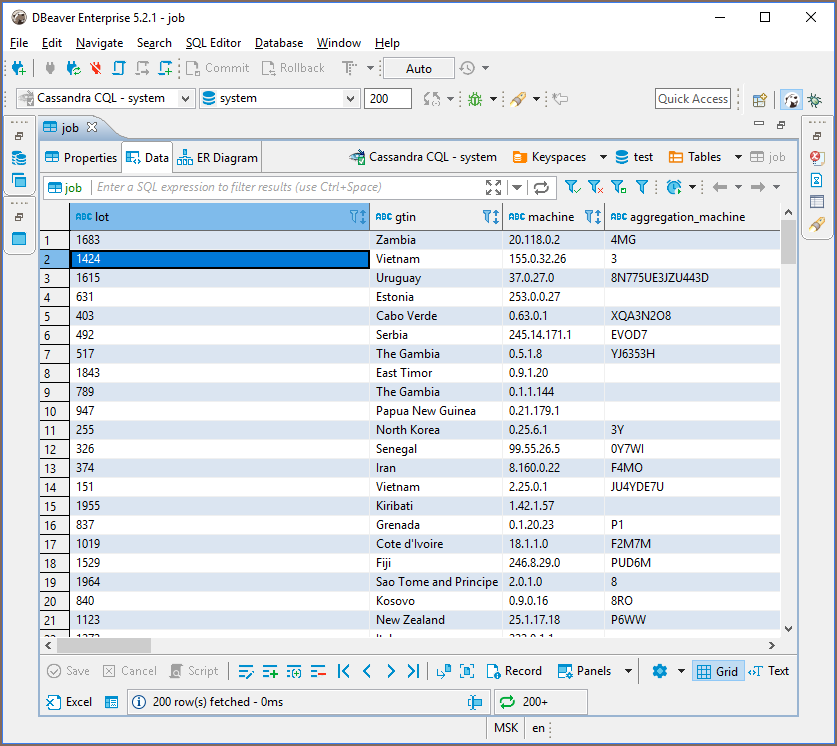You can browse, view, edit and filter Cassandra tables the same way as with regular (relational) tables. However, being a distributed key-value database, Cassandra does not support any kind of referential integrity. There are no foreign keys, references, etc. You should note that Cassandra has a very advanced (comparing to relational databases) data type system. Each column may be a collection, map, or set of values (with very big number of values). In some cases this makes browsing data in the "Grid" mode inconvenient.