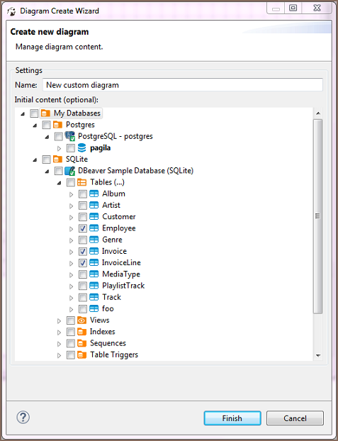 In both cases, in the Diagram Create Wizard, specify the diagram name and (optional) choose the initial diagram contents (set of tables):