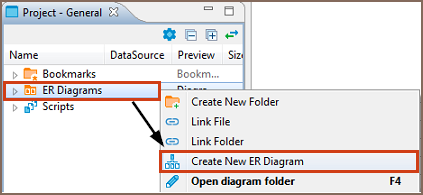 - In the Project Explorer view, right-click the ER Diagrams node and then click Create New ER Diagram on the context menu.